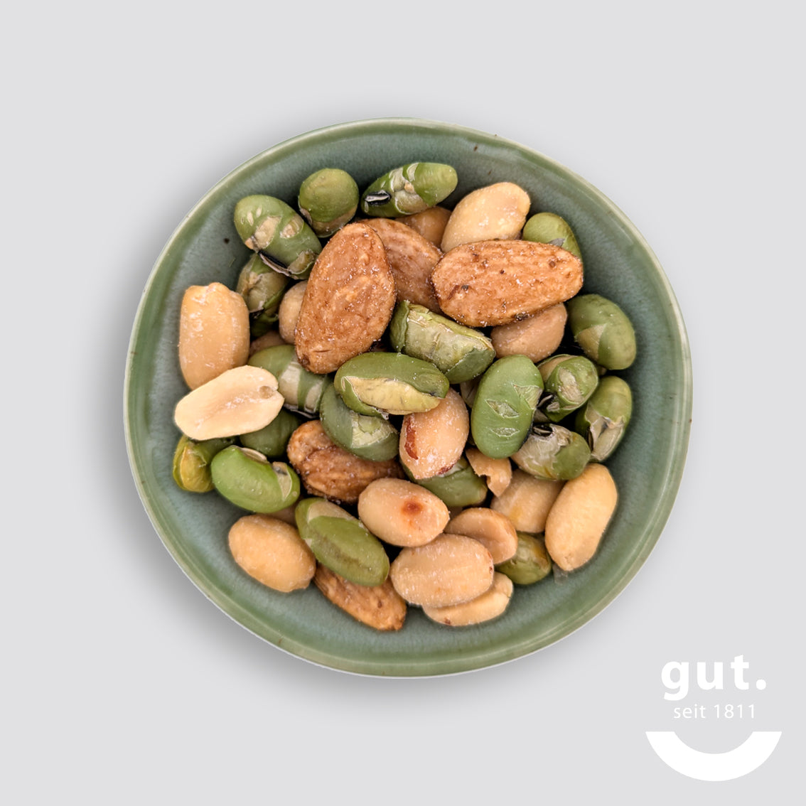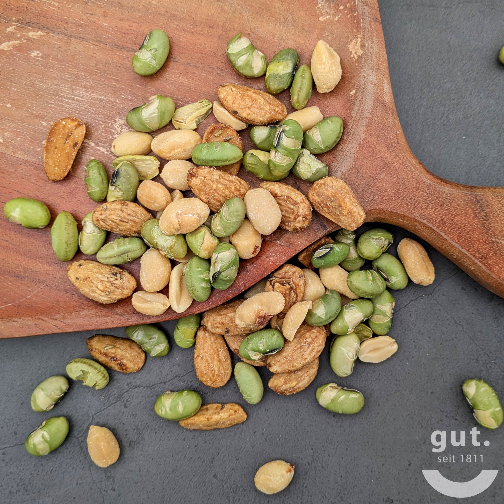 Zutaten: Edamame geröstet mit Salz (SOJAbohnen, Salz, Backtriebmittel: Natriumcarbonat), MANDELN geröstet mit Rosmarin (MANDELkerne, Zucker, Rosmarin, Salz, Kichererbsenmehl), ERDNÜSSE geröstet & gesalzen (ERDNÜSSE, 1,5% ERDNUSSÖL, 0,8% Salz).