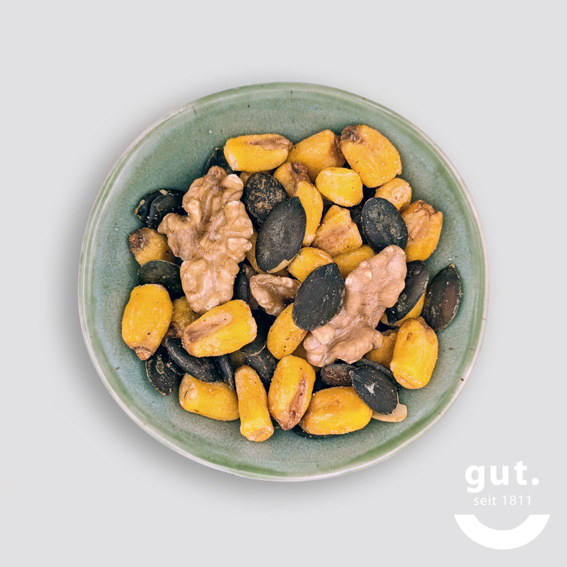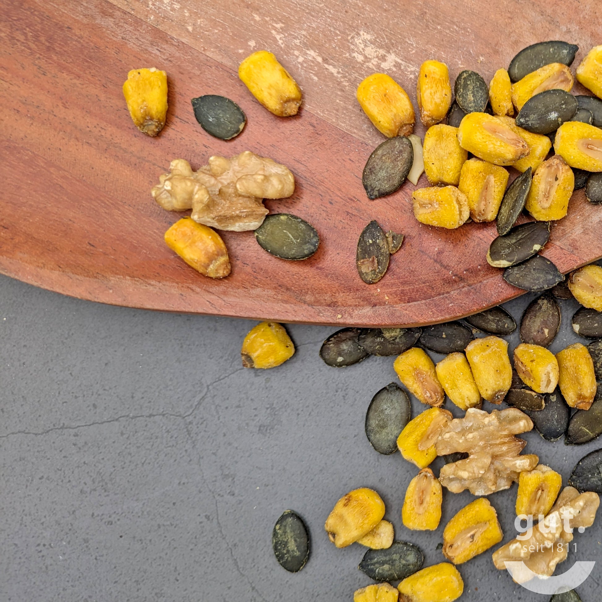 Zutaten: Giant Corn (Mais, Sonnenblumenöl, Salz), steirische Kürbiskerne geröstet und gesalzen, WALNÜSSE gebrochen