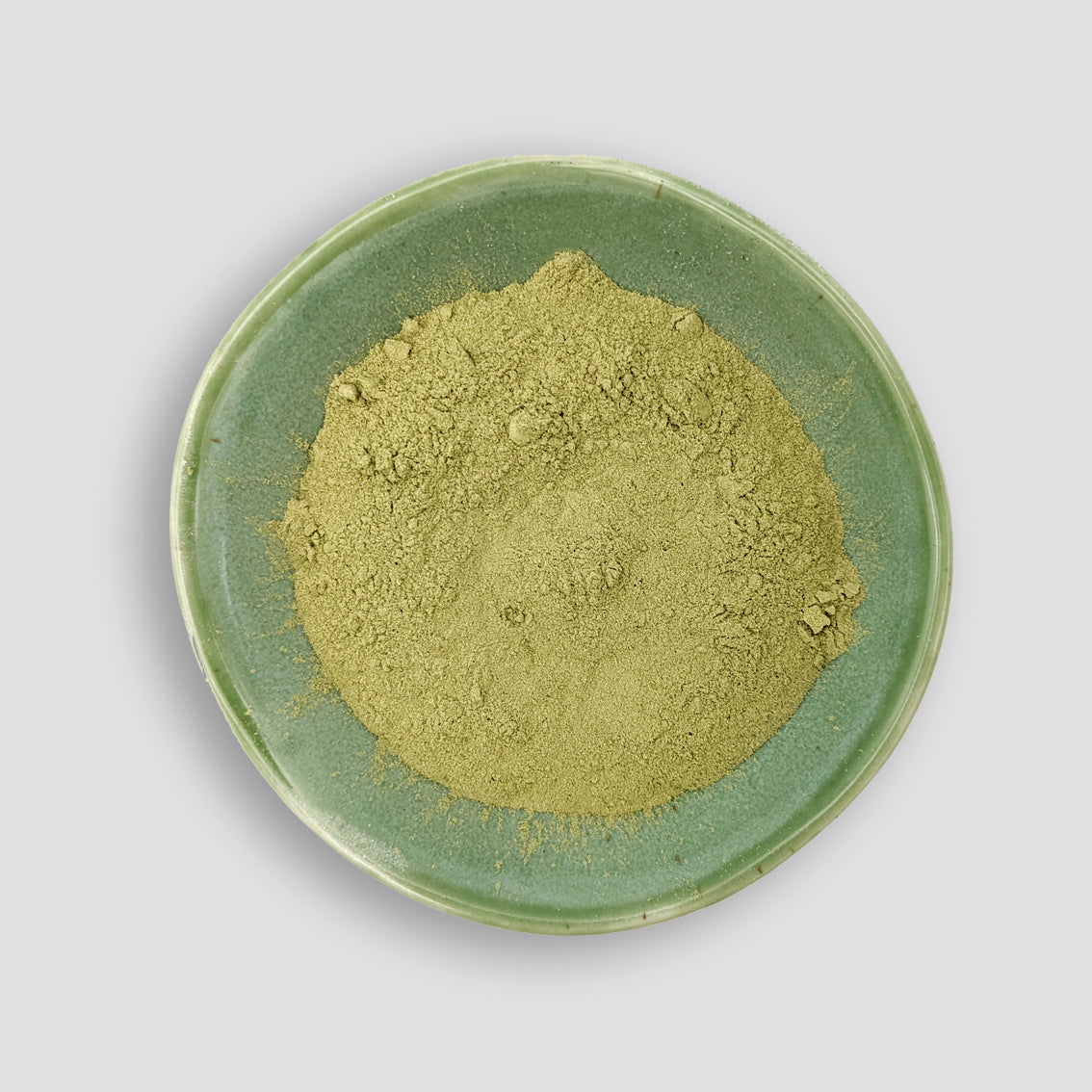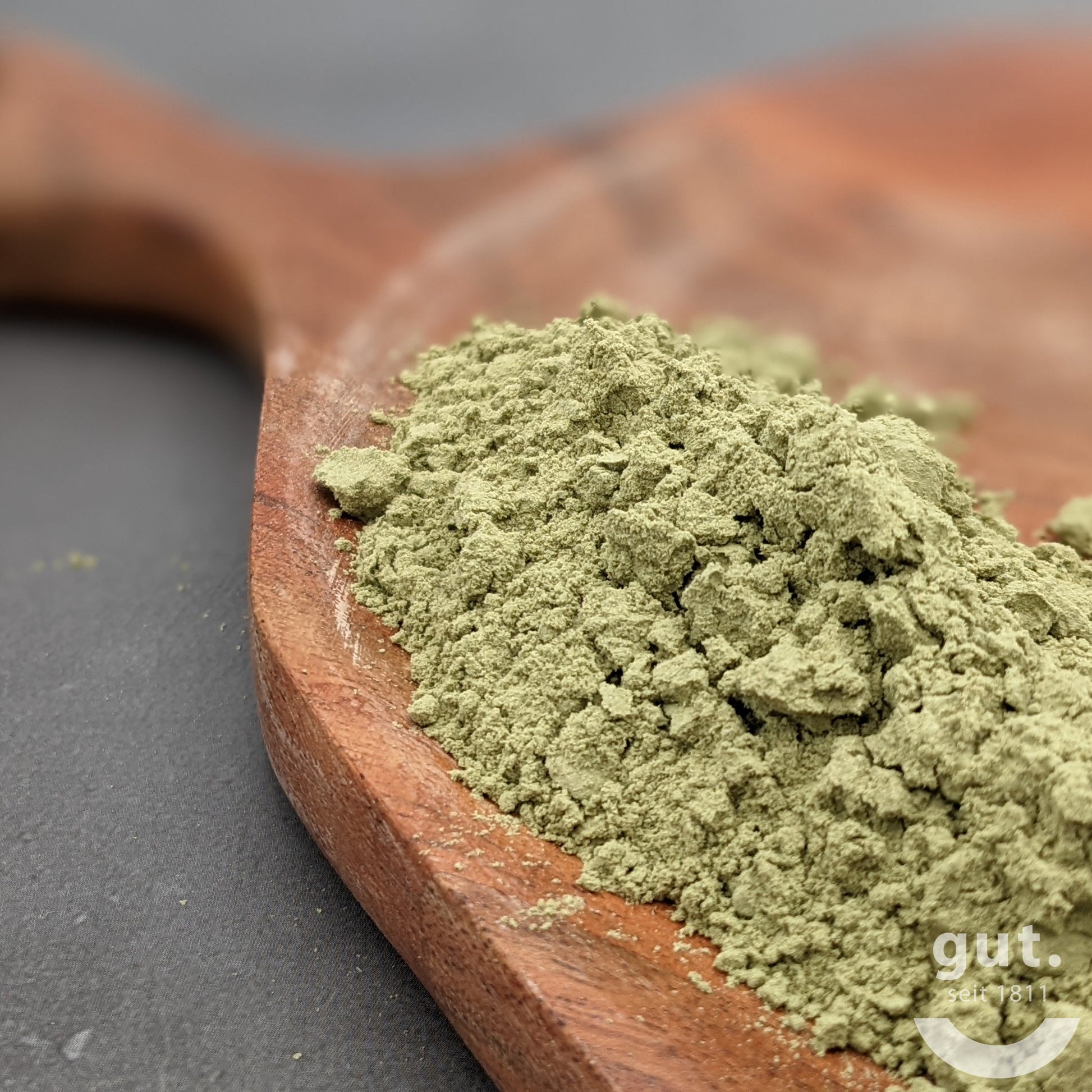 Weizengras Pulver (Triticum Aestivum L.) wird aus den jungen Keimblättern der Weizenpflanze gewonnen. Es duftet nach Natur und frischem Heu.
